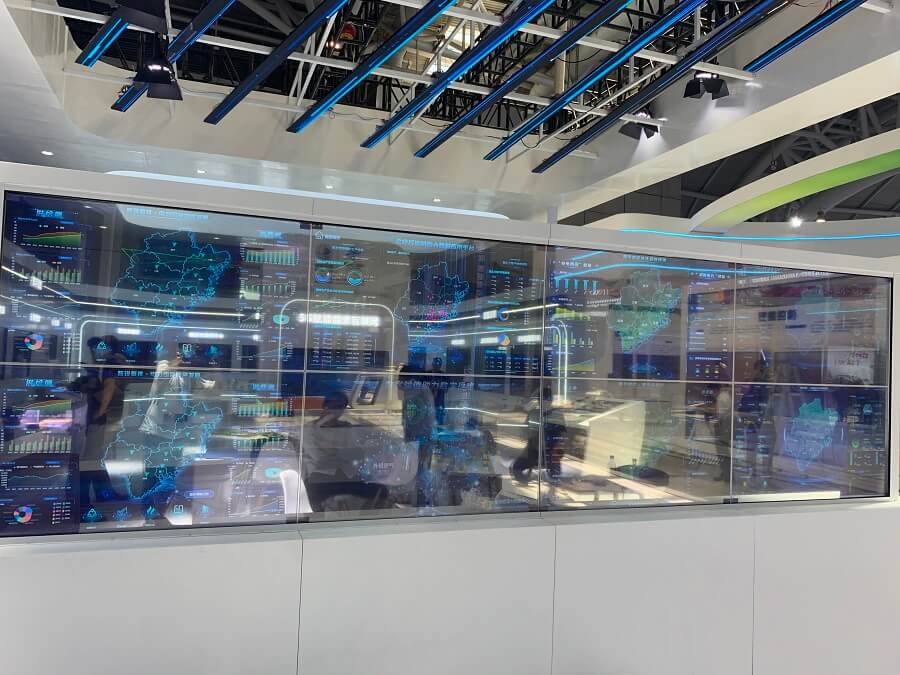本项目采用了8台55寸OLED透明显示屏组合而成,自带红外触摸系统,为用户提供了更加便捷的查询使用方式。本机主要用于展示福建省信息大数据,